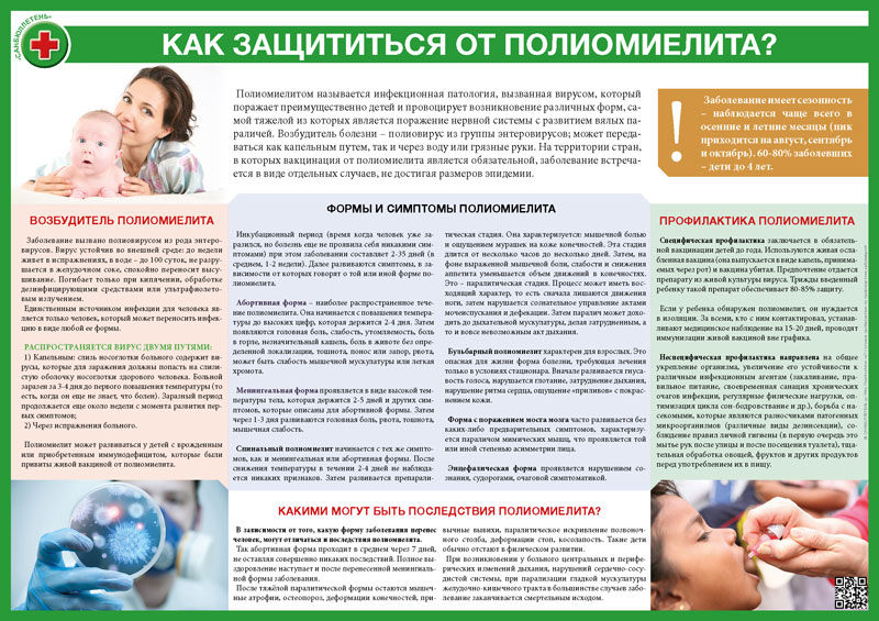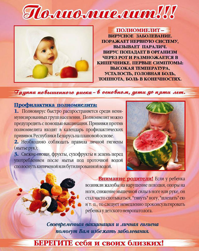Наиболее мощным, доступным и эффективным средством предупреждения паралитического полиомиелита является вакцинация. Полиомиелит неизлечим, но его можно предупредить с помощью вакцинации. Вакцинация проводится в соответствии с Национальным календарем профилактических прививок. Для вакцинации применяется оральная живая полиомиелитная вакцина (ОПВ). Побочные эффекты и осложнения от вакцинации практически отсутствуют. Иммунизация – мера необходимая. Отказываясь от прививок, Вы подвергаете своих детей риску развития тяжелого неизлечимого заболевания, приводящего к инвалидности.