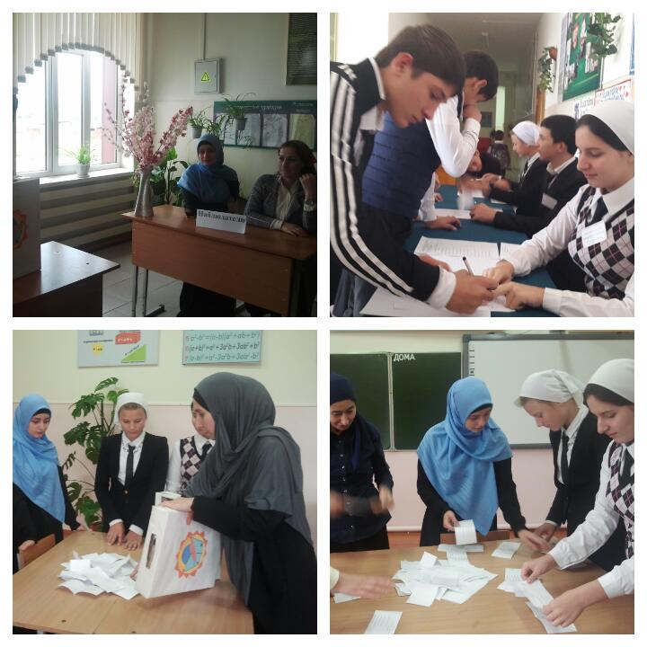 В фойе школы 20.10.2016г. собрались учащиеся 5-9 классов, учителя. Для проведения голосования была сформирована избирательная комиссия в составе трех человек. Председатель комиссии Бадиев Ислам (ученик 9 класса)., член комиссии Базалаева Заира (ученица 9 класса)., секретарь комиссии Хачукаева Иман ( ученица 8 класса). Избирательная комиссия школы работала с 12.30 до 14.00. На избирательном участке присутствовали наблюдатели учителя Муциева М.А., Ахарашева С.З.
