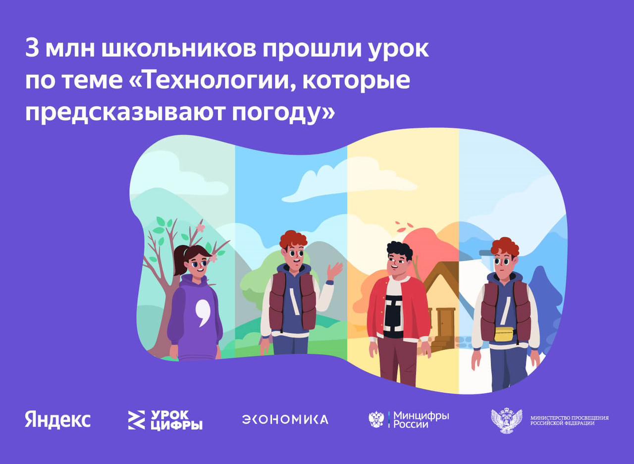 «Я считаю, что игра – один из лучших способов познакомить школьников с миром ИТ. Именно поэтому "Урок цифры" проводится в виде увлекательных онлайн-игр для учащихся всех классов. На тематических тренажерах ребята изучают алгоритмы и работу искусственного интеллекта, кодирование и технологии машинного обучения, управление проектами и обеспечение безопасности в онлайне», — подчеркнула директор Департамента координации программ и проектов Татьяна Трубникова. «Мы подготовили интерактивный урок, на котором дети узнали, как выглядит настоящая метеорологическая станция и какие технологии помогают предсказывать погоду. А ещё сотрудники Яндекс Погоды рассказали, сколько видов снежинок существует, бывают ли перламутровые облака, почему небо голубое и как рождается ветер. Думаю, нам удалось заинтересовать школьников всех возрастов и показать, что прогноз погоды — это не что-то скучное из телевизора, а современная область, в которой нужны самые разные специалисты», — поделился директор по развитию образования Яндекса Сергей Бражник. «Наш проект «Урок цифры» за время своей работы познакомил миллионы школьников с IT-профессиями, а ещё расширил кругозор по многим другим предметам и сферам. Например, возможности искусственного интеллекта совершенно по-новому были раскрыты через метеорологическое прогнозирование — это прикладная тема, интересная каждому. У «Яндекса» получилось объяснить достаточно сложную тему доступно и понятно: в итоге почти 3 млн школьников по всей стране прошли урок. Отличный результат и, как всегда, слаженная качественная работа!» - комментирует генеральный директор АНО «Цифровая экономика» Сергей Плуготаренко. Справочно: Проект «Урок цифры» реализуется в поддержку федерального проекта «Кадры для цифровой экономики». Занятия на тематических тренажерах проекта проводятся в виде увлекательных онлайн-игр для трех возрастных групп: учащихся младшей, средней и старшей школы. Методические материалы уроков остаются в доступе на сайте проекта и охватывают широкий круг тематик: алгоритмы, кодирование, командная разработка, безопасность в Интернете, управление проектами, искусственный интеллект, машинное обучение, персональные помощники, сети и облачные технологии, большие данные, беспилотный транспорт, нейросети и коммуникации, приватность в цифровом мире. Инициаторы «Урока цифры» — Министерство просвещения РФ, Министерство цифрового развития, связи и массовых коммуникаций РФ и АНО «Цифровая экономика». Задачами проекта являются развитие у школьников цифровых компетенций и ранняя профориентация: уроки помогают детям сориентироваться в мире профессий, связанных с компьютерными технологиями и программированием. Партнёрами проекта в 2022/23 учебном году выступают «Лаборатория Касперского», Благотворительный фонд Сбербанка «Вклад в будущее», фирма «1С», компании Яндекс, VK, Росатом. С 2018 года уроки прошли более 62 млн раз.